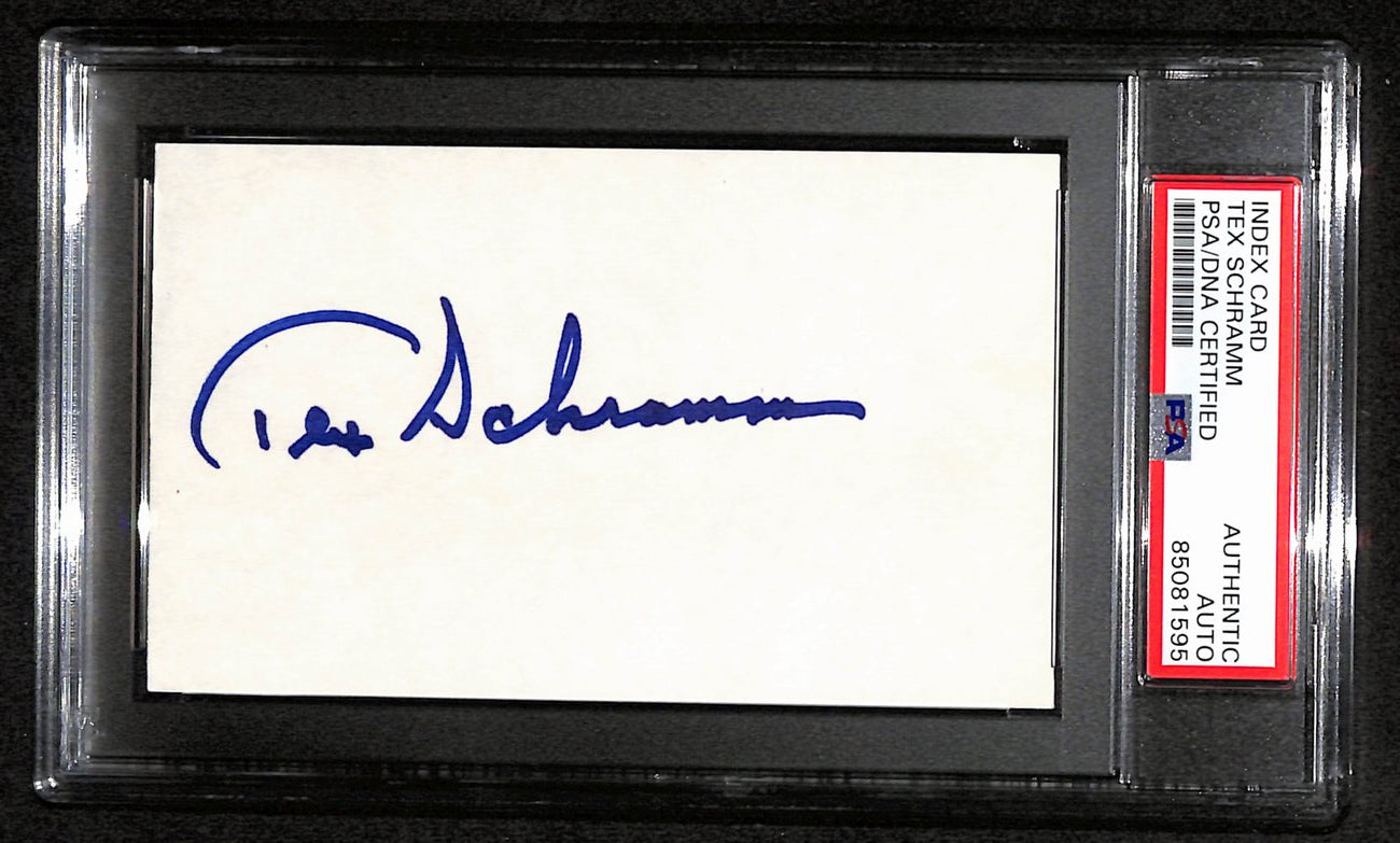 Offered is a Tex Schramm HOF Signed 3x5 Index Card Dallas Cowboys. This Card is authenticated by PSA/DNA and is encapsulated in their tamper-proof plastic case.