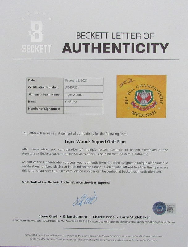 Offered is a Tiger Woods Signed 20" x1 3.5" Medinah Official Pin Flag 1999 PGA Champ. This flag is authenticated by BAS/Beckett and includes their Tamper-proof Hologram Sticker and Letter of Authentication.