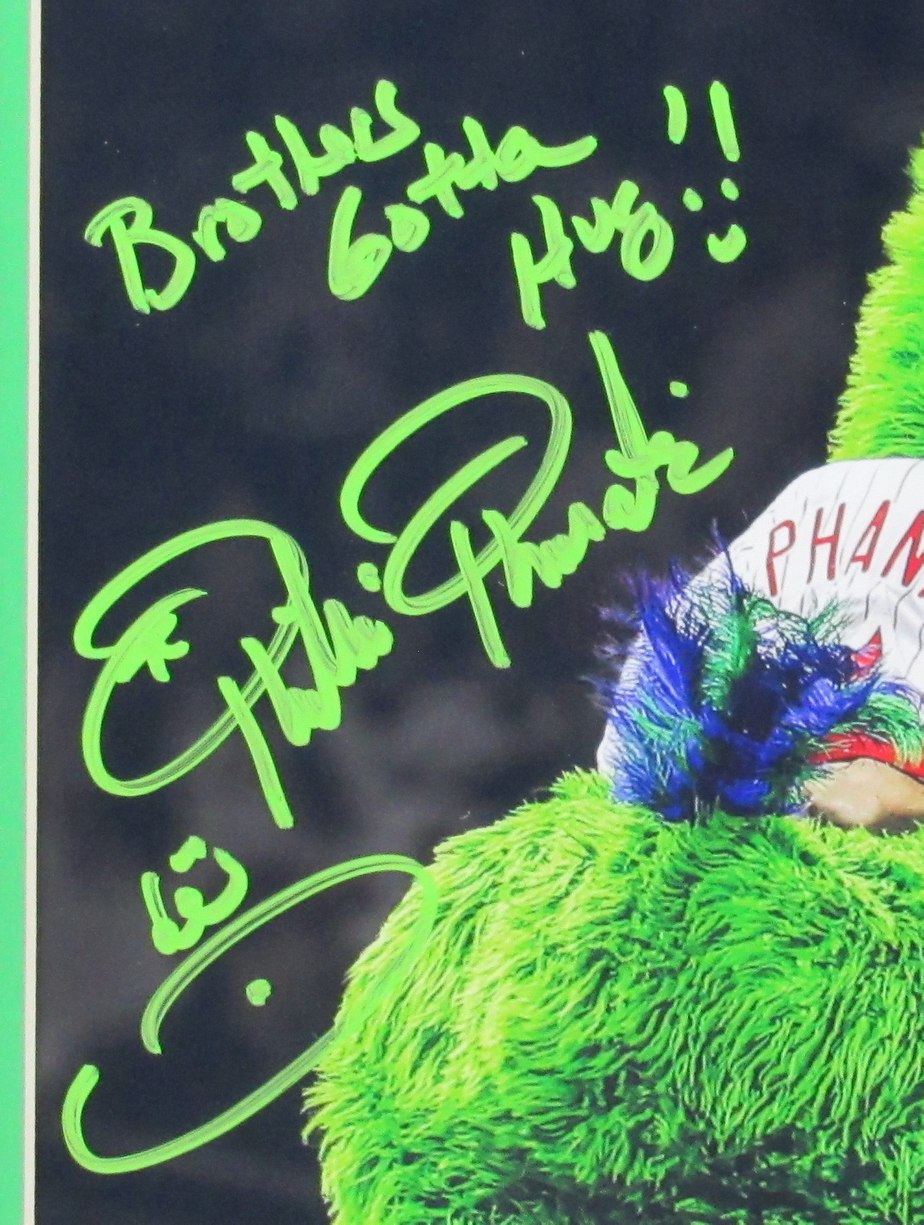 Offered is a Tom Burgoyne "Phillie Phanatic" Signed/Inscribed "Brothers Gotta Hug!" 18x22 Photo with Jason Kelce Framed. The outer frame size is 26 inches x 26 inches. This photo is authenticated by JSA and contains their Tamper-proof Hologram Sticker and Certificate of Authenticity.