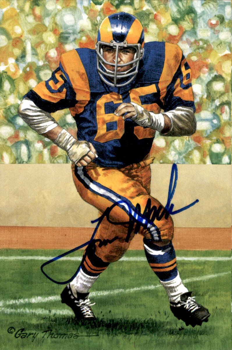 Offered is a Tom Mack Rams HOF Autographed Goal Line Art GLAC Postcard JSA