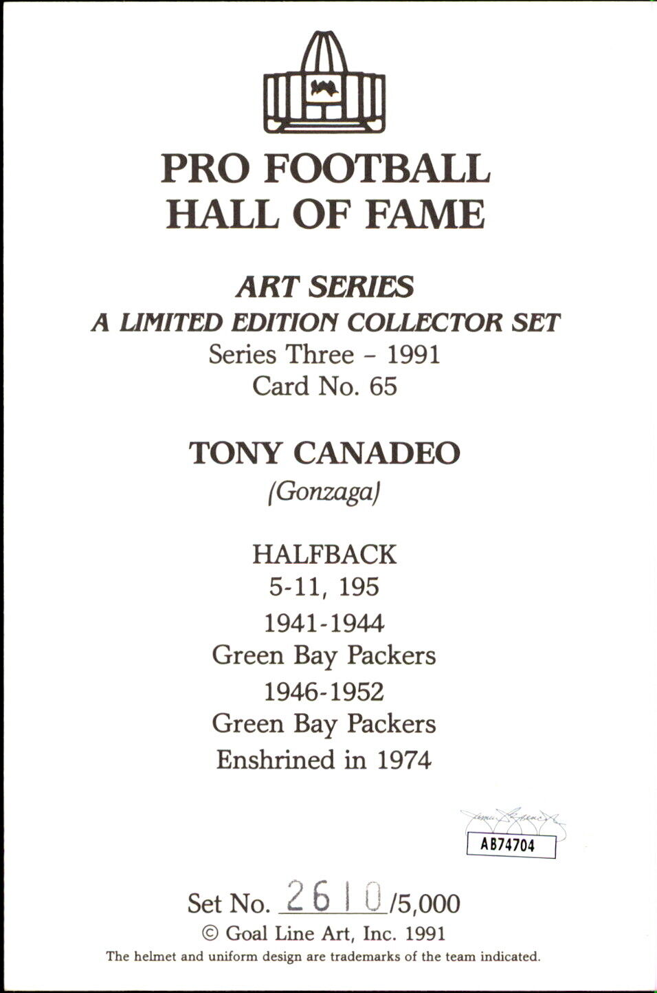 Tony Canadeo HOF Autographed Goal Line Art GLAC Postcard Green Bay Packers JSA