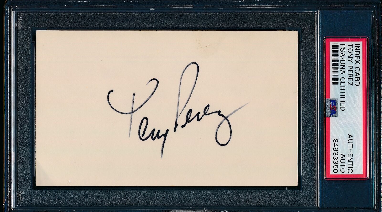 Offered is a Tony Perez HOF Autographed 3x5 Index Card Cincinnati Reds. This index card is authenticated by PSA/DNA and is encapsulatd in their tamper-proof plastic case.