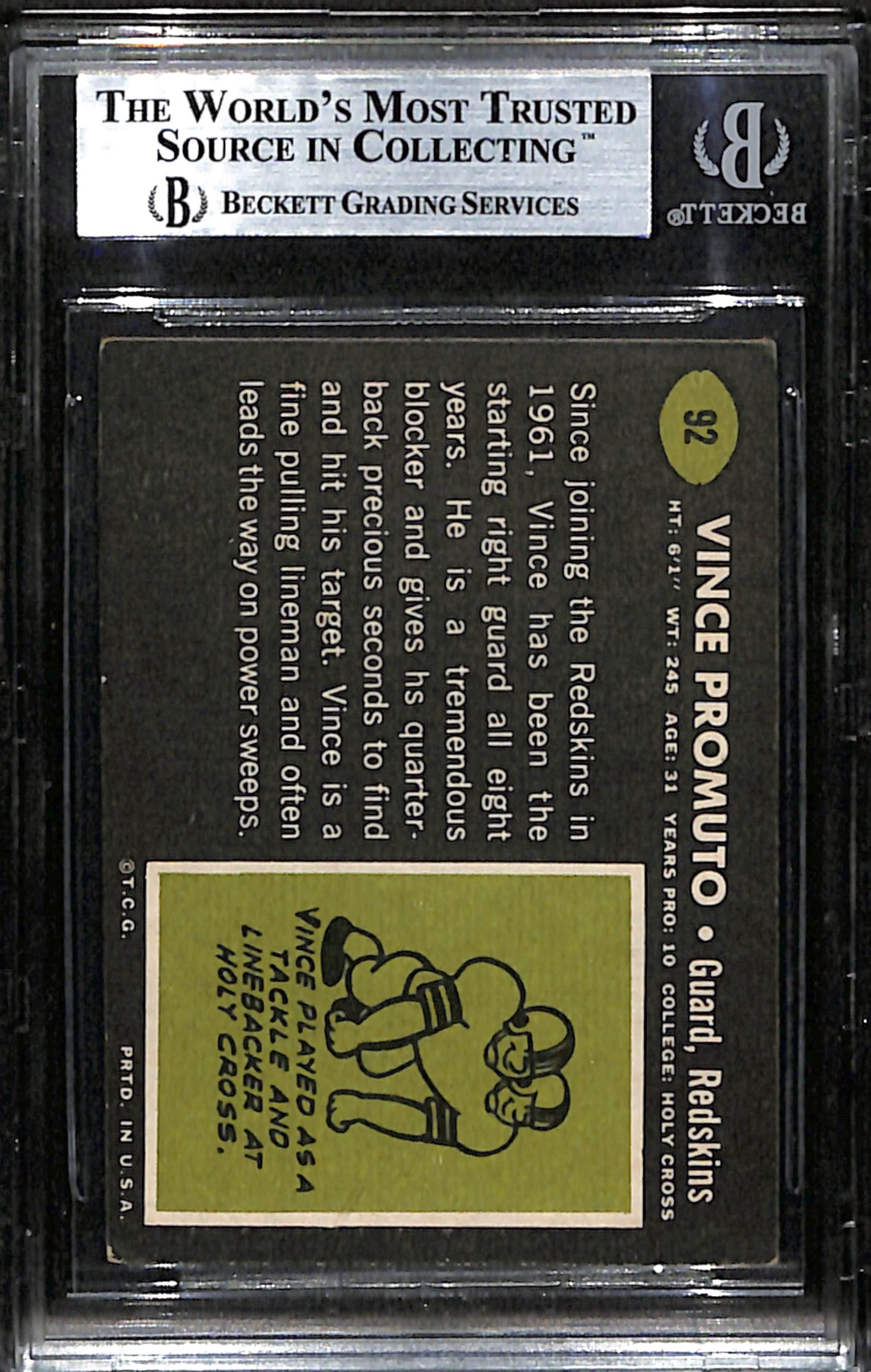 Offered is a Vince Promuto Signed 1969 Topps Card #92 Washington Redskins. This Card is authenticated by BAS/Beckett and is encapsulated in their tamper-proof plastic case.