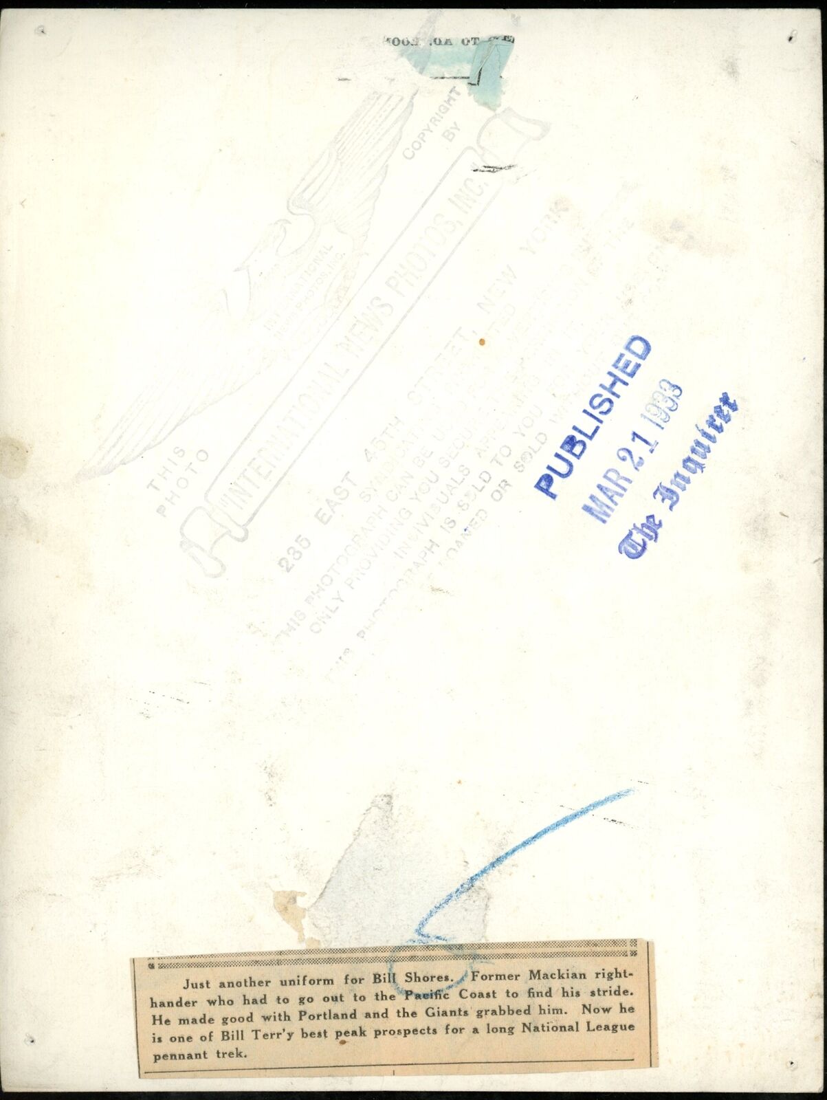 Offered is a Vintage 1933 Bill Shores 6.5x8.5 Press Photo Philadelphia Athletics.
