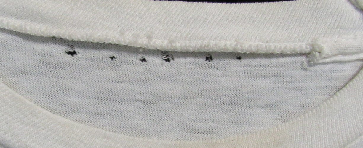 Offered is a vintage Mickey Mantle "Champion Slugger" child's t-shirt, c.1950s (VG/EX-EX/MT). This white t-shirt has some small stains along with some holes around the back collar (VG/EX).