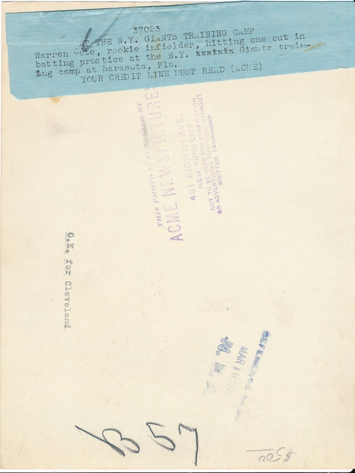 Offered is a Warren Cote 6x8 B/W 1927 Press Wire Photo New York Giants.